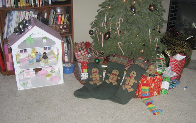 Savannah woke up at 4:00 ready to go. However, Hyrum and I were not so willing. We told her she had to wait. She chose to "wait" on our bed and didn't fall asleep again until about 6:00. Ugg.. When we finally went out to see what Santa had brought, we realized that she had already been out, because the doll family was in a different arrangement. Gotcha!